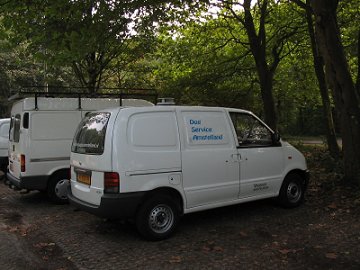 De busjes van DSA.DSA rijdt met twee busjes: een Suzuki met twee hokken en een Nissan Vanette met drie hokken. De honden reizen door deze inrichting veilig en comfortabel.Beide busjes zijn uitgerust met een ventilatiesysteem, waterbakken en een verbandtrommel die is samengesteld in overleg met een dierenarts. Kennis van EHBO is ook aanwezig. Een veilig gevoel... Waaraan moet uw hond voldoen?Wij stellen wel eisen aan uw hond: zo moet hij sociaal zijn met mensen en andere honden. Ook moet hij volgroeid zijn. Een uitlaatbeurt is namelijk voor een hond die nog niet volgroeid is te belastend. Wij houden voor kleine hondjes de minimum leeftijd aan van 1 jaar, voor grote honden geldt de minimum leeftijd van 1,5 jaar. Eventueel overleggen wij met uw dierenarts of het verantwoord is de hond mee te laten gaan. Verder mag uw hond niet loops zijn. Ook moet uw hond volledig zijn ingeënt. Dat wil zeggen: de jaarlijkse cocktail èn een enting tegen kennelhoest. En uw hond moet de door de boswachterij verplichte penning dragen, waarvoor wij een borgsom van 10 euro vragen.